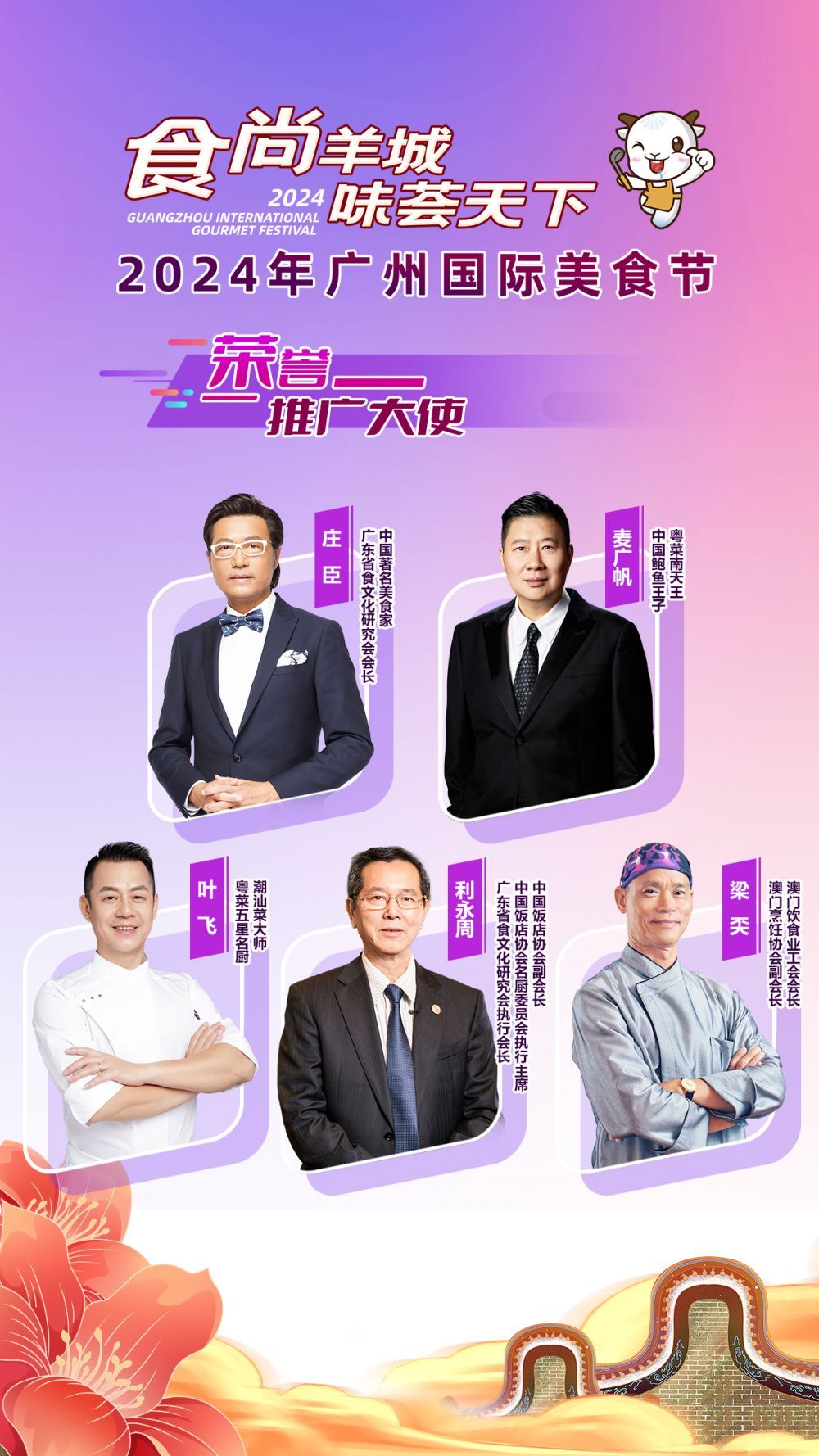 就在明天,备受瞩目的2024年广州国际美食节即将盛大启幕!作为本次美食节重要的一顶宣传活动,本次美食节邀请到5位美食界领军人物担任荣誉推广大使,他们分别是中国著名美食家庄臣、粤菜南天王麦广帆、中国饭店协会副会长利永周、潮汕菜大师叶飞及澳门饮食业工会会长梁奀。